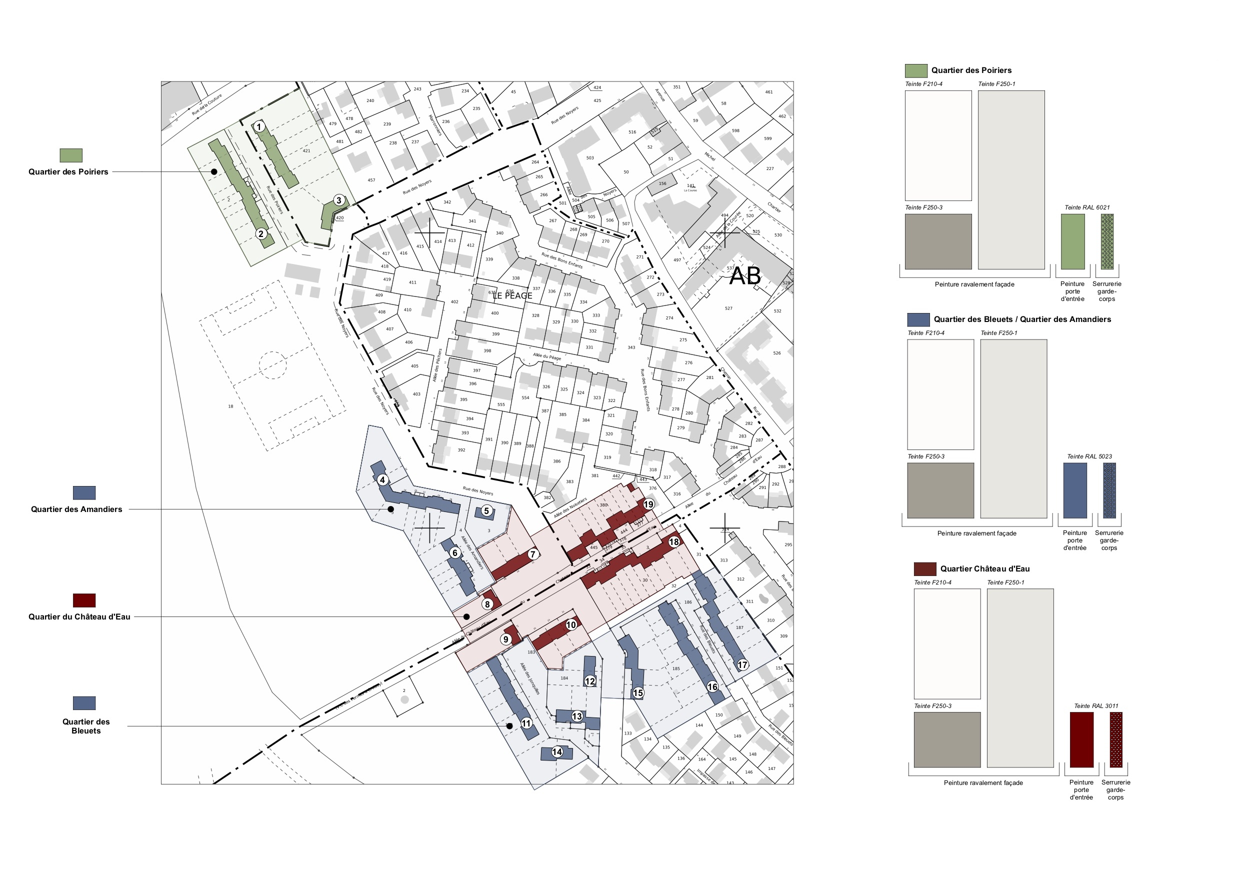– Quartier du Château d’Eau : Teinte Rouge Brun (RAL 3011) – Quartier du Poiriers : Teinte Vert Pâle (RAL 6021)