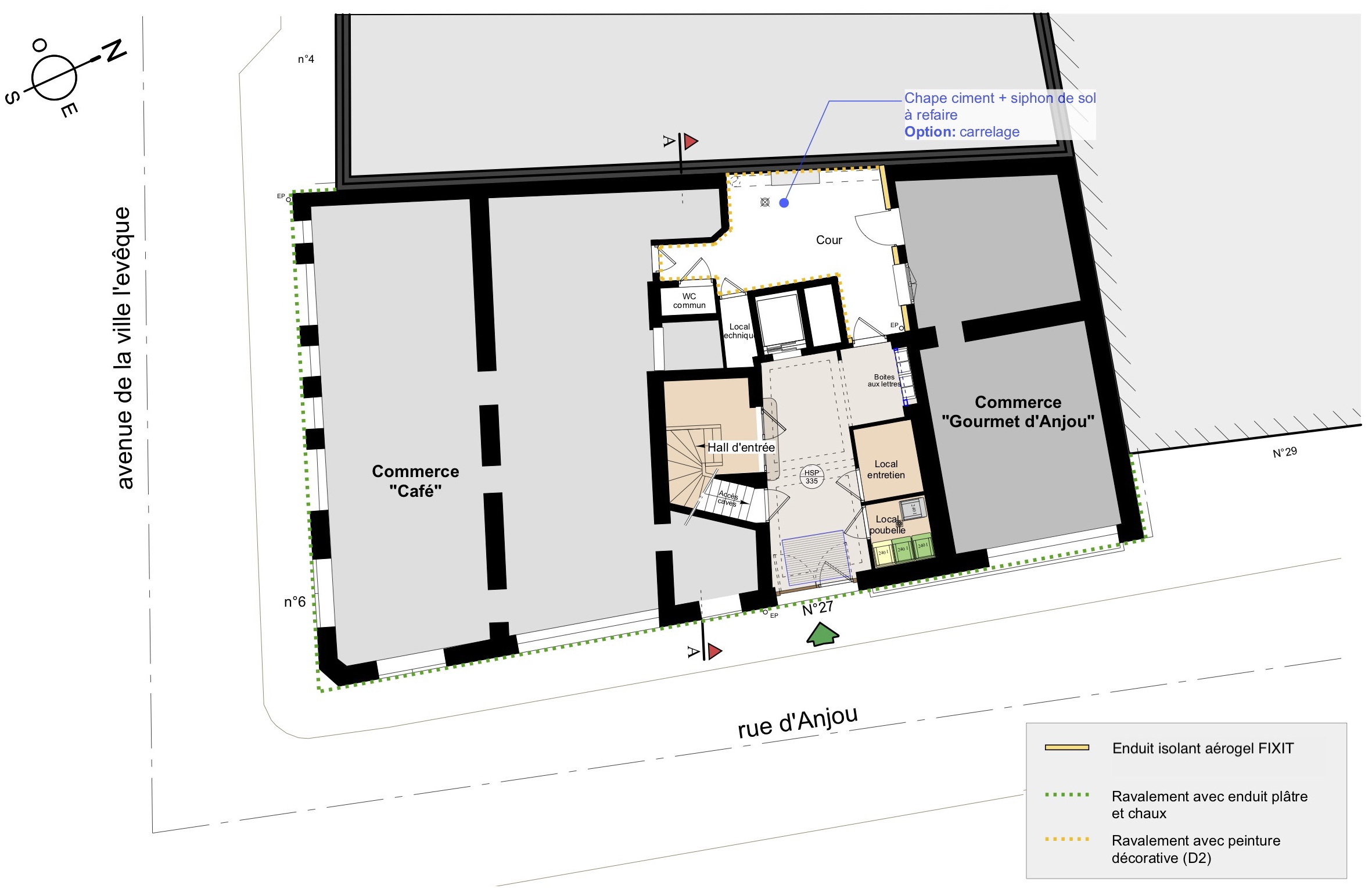 – Ravalement façades sur cour avec enduit isolant aérogel FIXIT après dégarnissage complet de tous les enduits plâtre existants