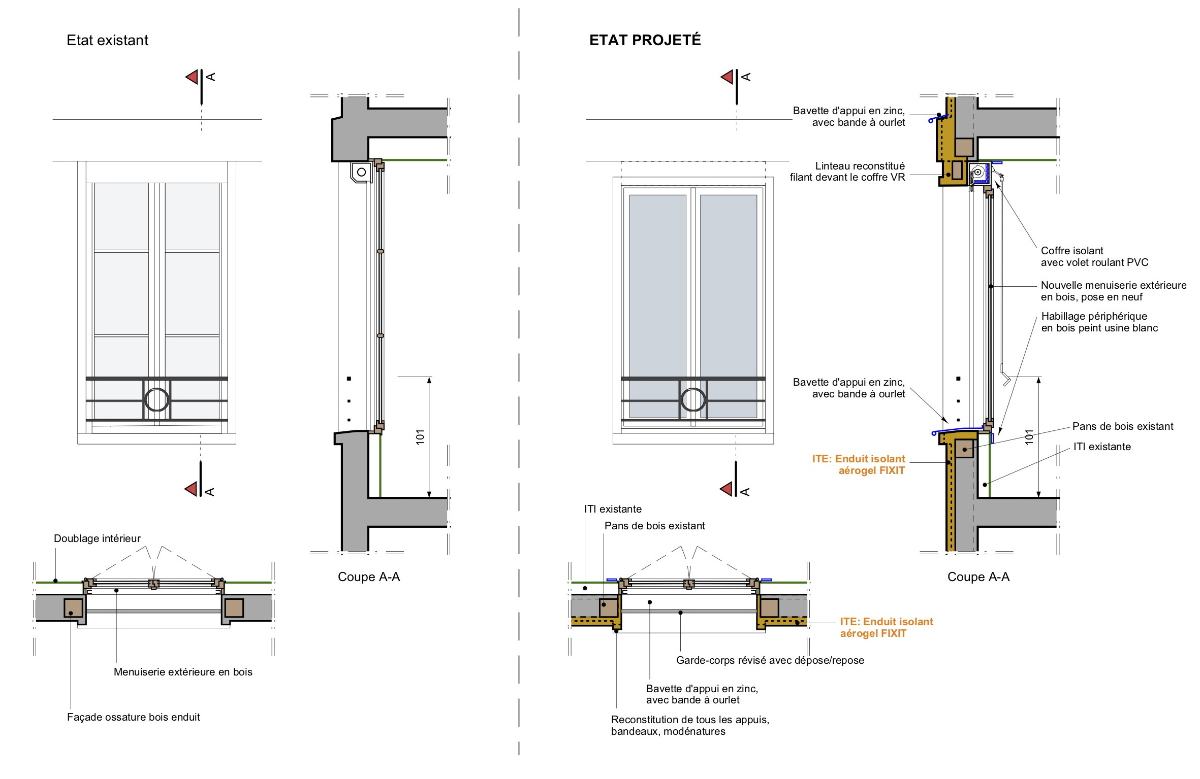 – Pose de volets roulants PVC en tableau dans la baie existante avec reconstitution d’un linteau maçonné afin de dissimuler les coffres (façades sur cour)