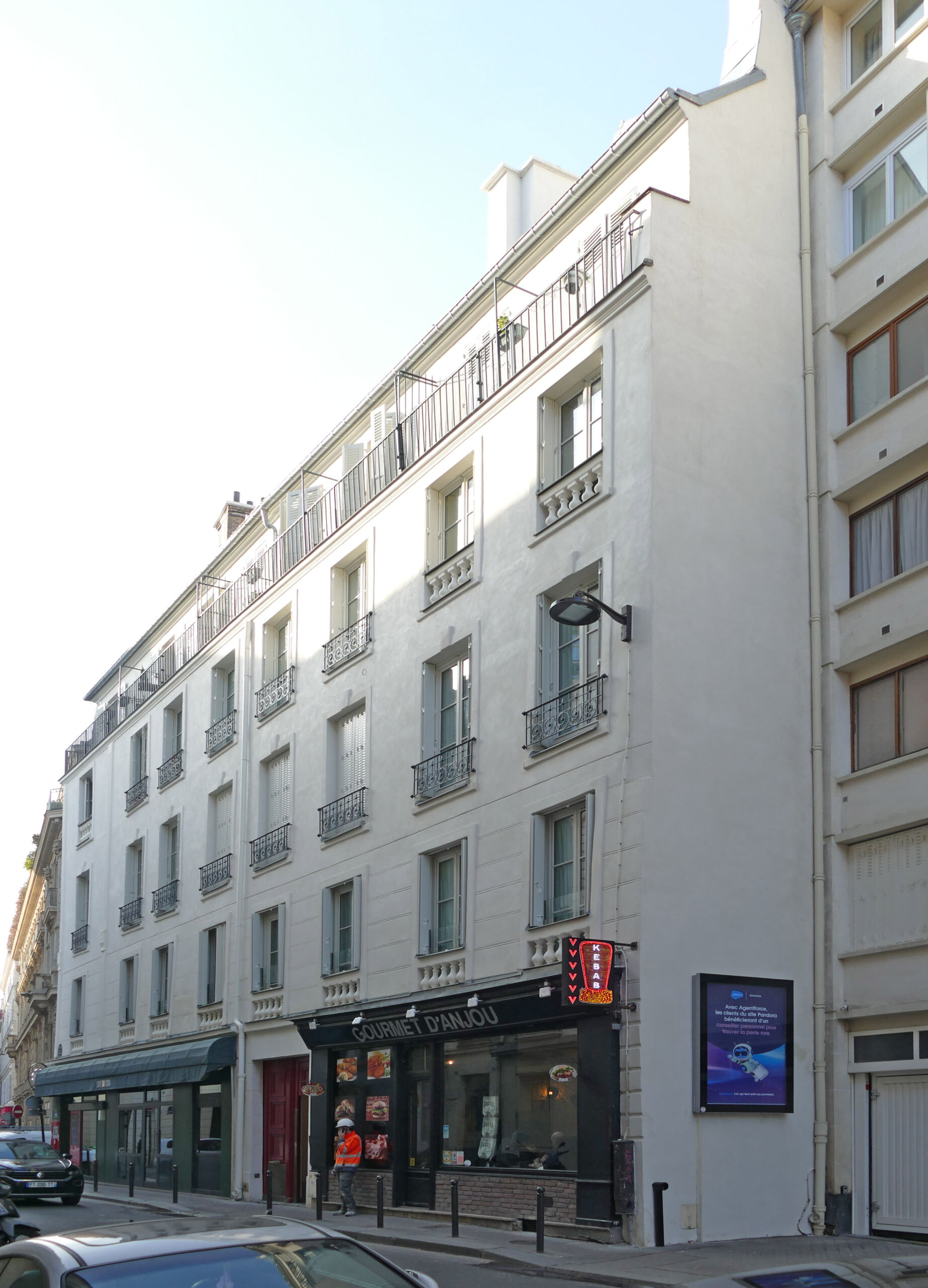 L’immeuble jouit d’une position à l’angle des rues d’Anjou et Ville d’Evêque, et développe ainsi ses 2 façades principales sur rue. Cette position privilégiée est accentuée par le retrait des immeubles mitoyens, qui mettent ainsi l’immeuble en exergue, mais dévoile partiellement ses 2 héberges.